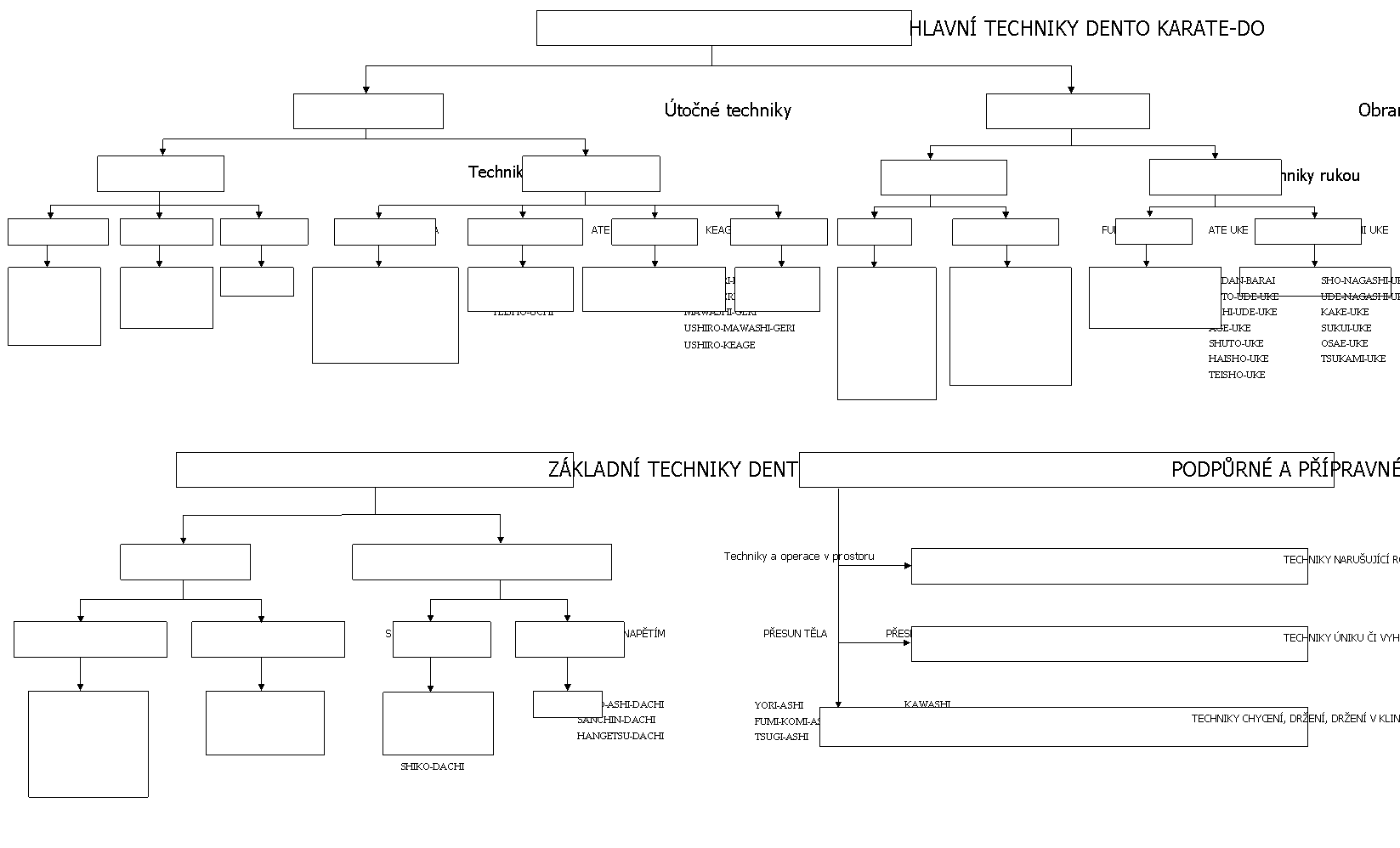 Základní techniky TRADIČNÍHO KARATE vznikly na Okinawě (Japonská država) ve formě KATA nebo kombinací obranných a útočných pohybů. Technické uspořádání může být popsáno následovně.
